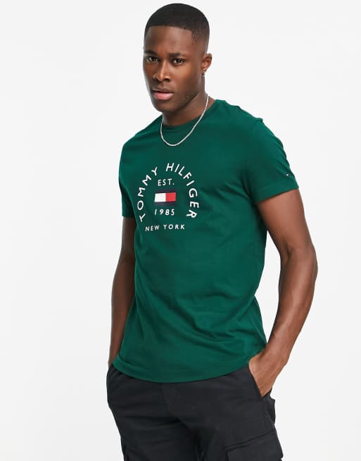 Tommy Hilfiger – Ciemnozielony bawełniany T-shirt z półokrągłym logo z flagą