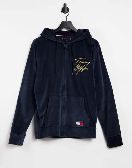 Tommy Hilfiger – Granatowa welurowa bluza z kapturem i złotym logo