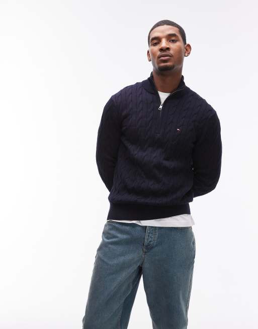 Tommy Hilfiger – Granatowy sweter z dzianiny o warkoczowym splocie z suwakiem pod szyją