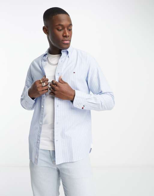Tommy Hilfiger – Niebieska koszula w paski z długimi rękawami i z logo w formie flagi