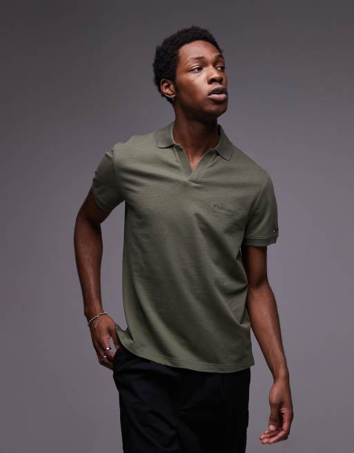 Tommy Hilfiger – Oliwkowozielona koszulka polo z otwartym kołnierzem i logo