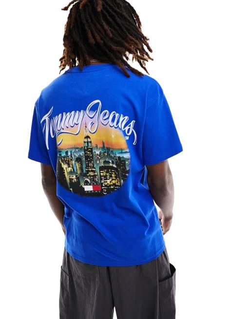 Tommy Jeans – Niebieski T-shirt o luźnym kroju z nadrukiem miasta