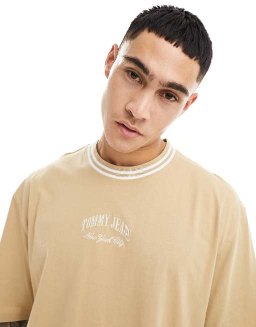 Tommy Jeans – Piaskowy T-shirt oversize z kontrastowym wykończeniem
