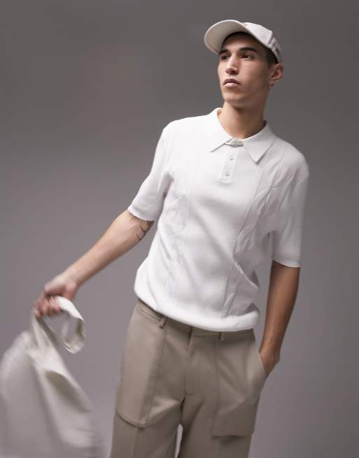 Topman – Biała koszulka polo z dzianiny z ozdobnymi prążkami