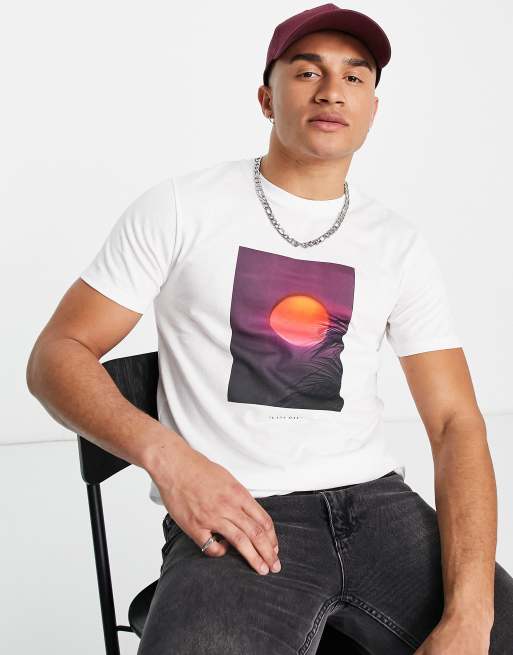 Topman – Biały T-shirt o klasycznym kroju z nadrukiem zachodu słońca