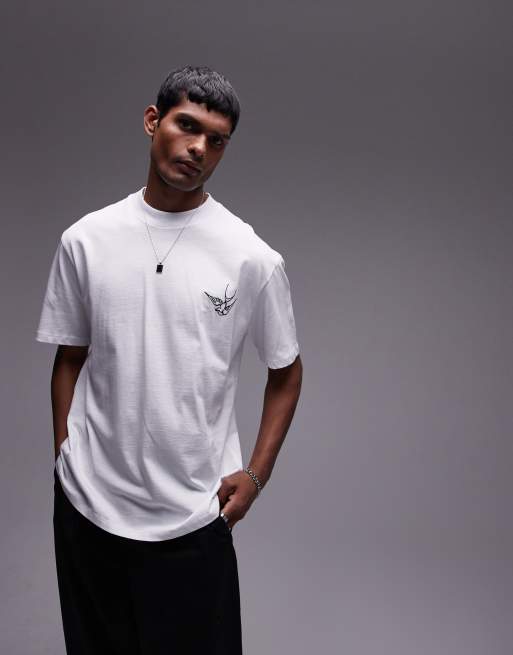 Topman – Biały T-shirt premium oversize z haftowanym wzorem jaskółek z przodu i na plecach
