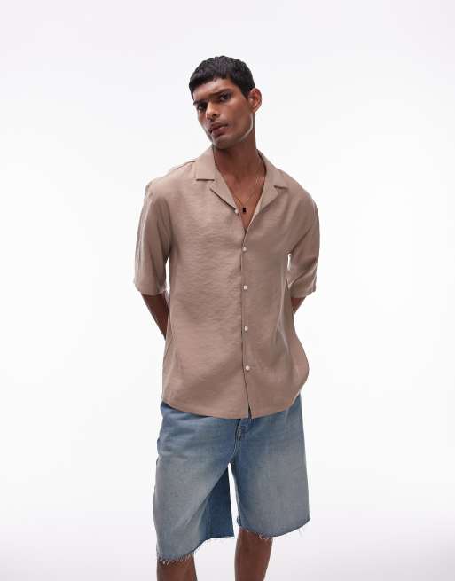 Topman – Camelowa satynowa koszula z krótkimi rękawami o luźnym kroju
