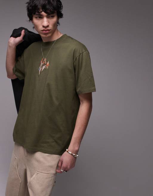 Topman – Ciemnozielony T-shirt premium z haftowanym wzorem kwiatowym