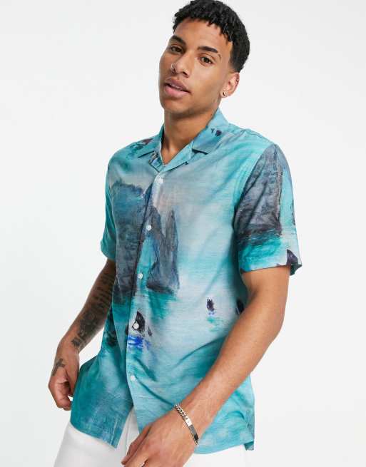 Topman Claude – Niebieska koszula z nadrukiem obrazu łodzi Claude'a Moneta