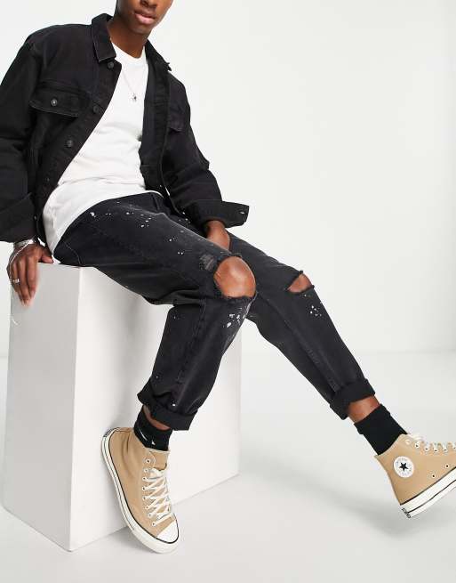 Topman – Czarne sprane jeansy o luźnym kroju z rozdarciami i plamami farby