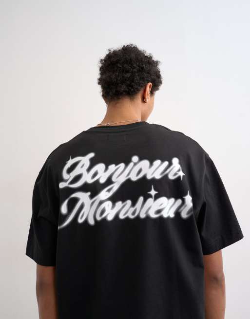 Topman – Czarny luźny T-shirt z nadrukiem z napisem „Bonjour”