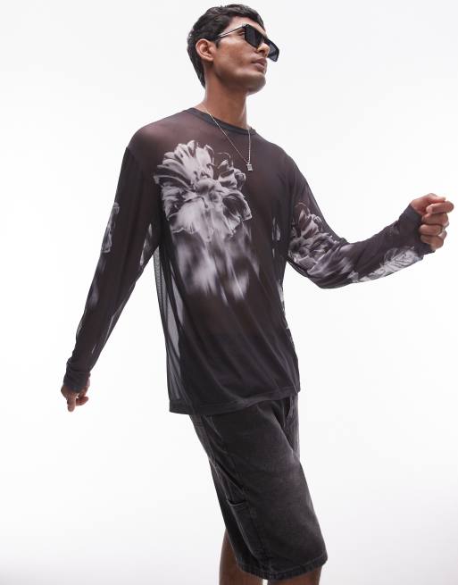 Topman – Czarny, siateczkowy T-shirt oversize z długimi rękawami, w kwiatowy wzór