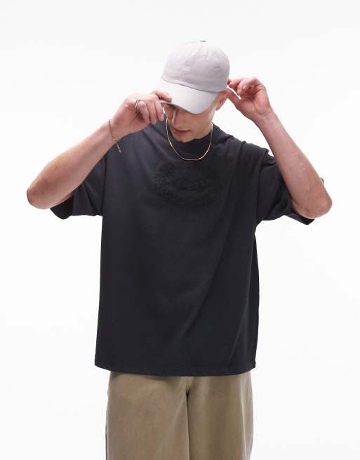 Topman – Czarny sprany T-shirt extreme oversize premium z haftowanym motywem uścisku dłoni