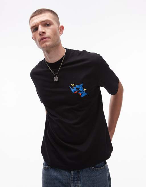 Topman – Czarny T-shirt o pudełkowym kroju z wyhaftowanymi jaskółkami