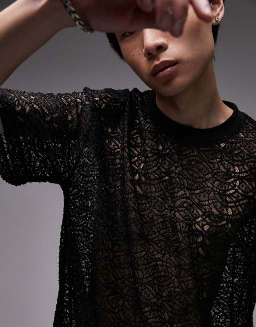 Topman – Festival – Czarny koronkowy T-shirt oversize
