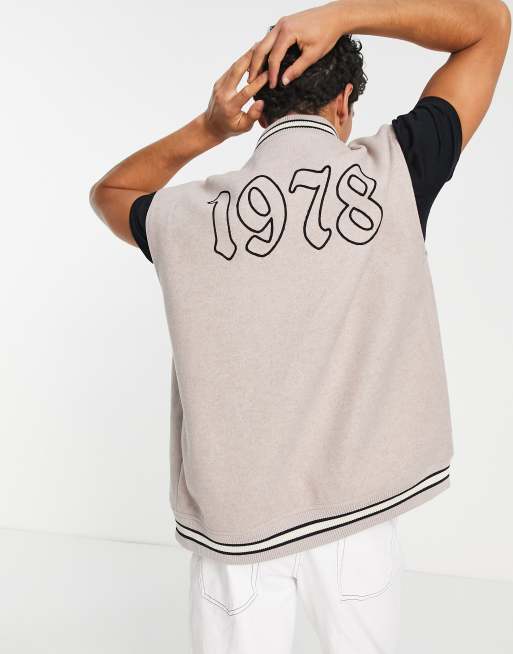 Topman – Kamiennobeżowa kurtka w stylu uczelnianym bez rękawów z ozdobnymi naszywkami