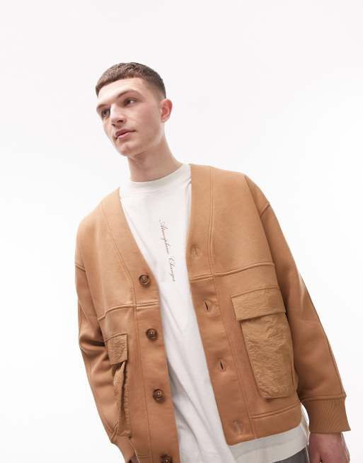 Topman – Kamiennobeżowy kardigan oversize z nylonowymi kieszeniami