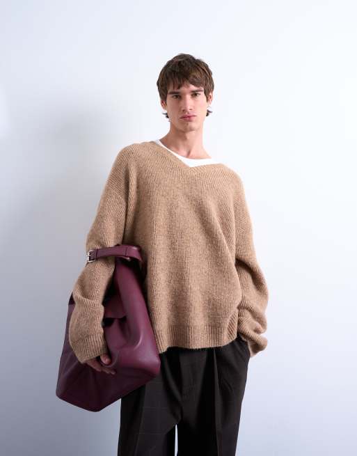 Topman – Kamiennobeżowy sweter oversize z dekoltem w szpic