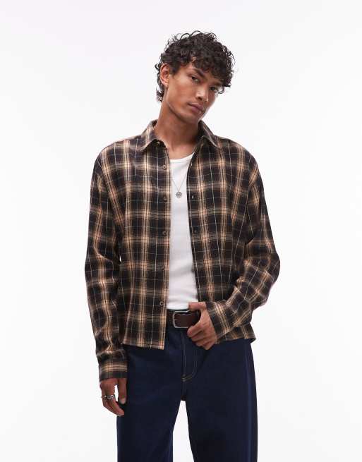 Topman – Luźna brązowa koszula flanelowa w kratę o krótkim fasonie