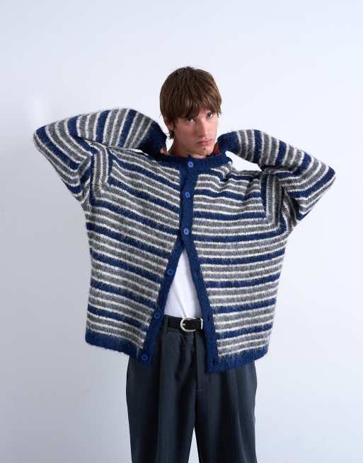 Topman – Niebieski kardigan z puszystej dzianiny w paski z okrągłym dekoltem