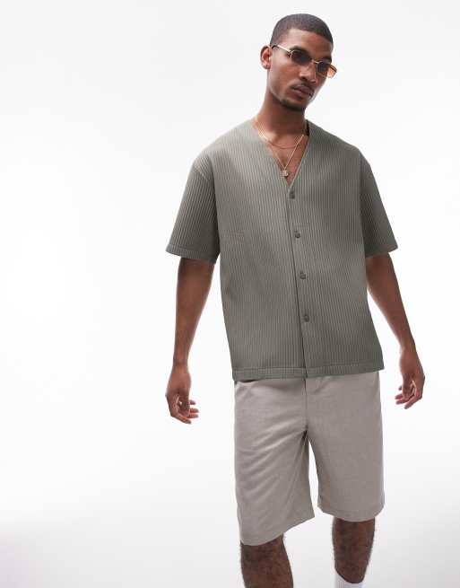 Topman – Plisowana koszula bez kołnierza z krótkim rękawem w kolorze khaki