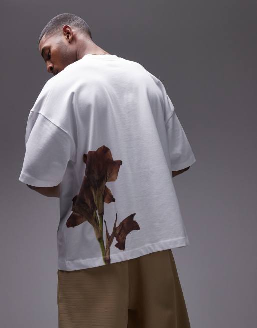 Topman Premium – Biały T-shirt extreme oversize z nadrukiem kwiatu z przodu i na plecach