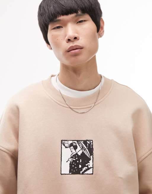 Topman – Szarobeżowa bluza oversize z nadrukiem z japońskim motywem