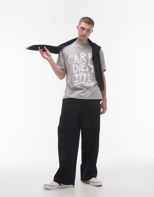 Topman – Szary melanżowy T-shirt o luźnym kroju z napisem „Carpe Diem”