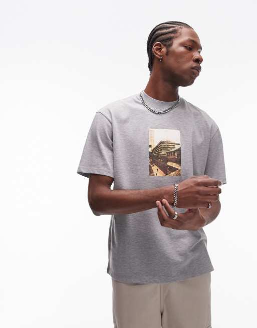 Topman – Szary melanżowy T-shirt oversize z nadrukiem zdjęcia Londynu