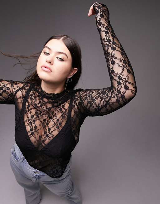 Topshop Curve – Czarny koronkowy top z golfem i długimi rękawami