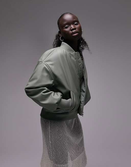 Topshop Petite – Zielona krótka kurtka bomberka z imitacji skóry