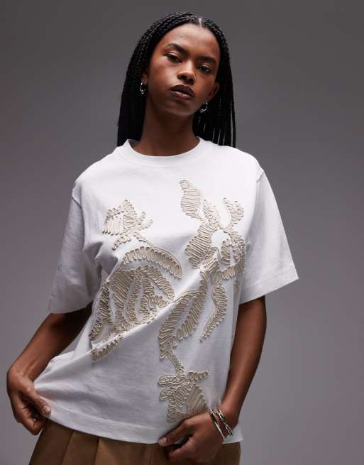 Topshop – Biały T-shirt oversize z haftowanym kwiatowym wzorem z rafii