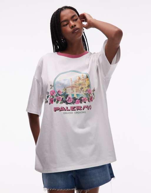 Topshop – Biały T-shirt oversize z wakacyjną grafiką z motywem Palermo