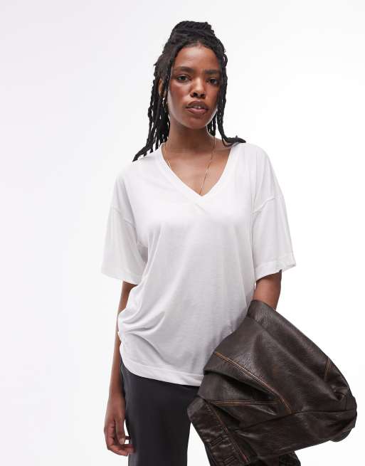 Topshop – Biały T-shirt z dekoltem w szpic o bardzo luźnym kroju