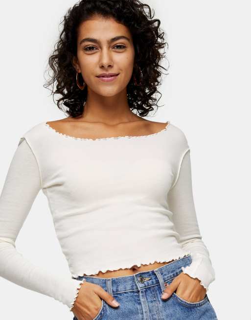 Topshop – Biały top z długim rękawem i karbowanym wykończeniem