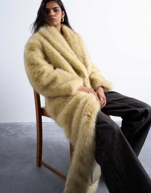 Topshop – Bladożółty bardzo długi płaszcz oversize ze sztucznego futra z szalowym kołnierzem