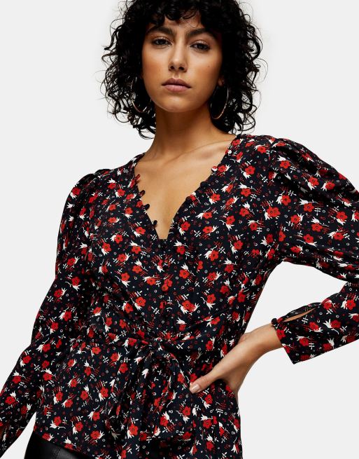 Topshop – Bluzka zapinana na guziki w czarno-czerwone kwiatki