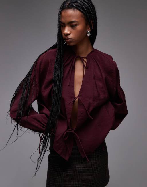 Topshop – Bordowy miękki w dotyku top z wiązaniem z przodu