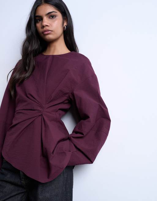 Topshop – Bordowy top z długim rękawem i zakładkami z przodu