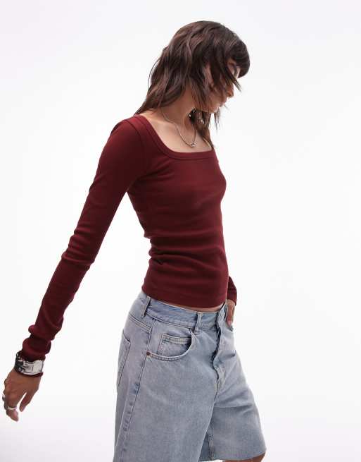 Topshop – Bordowy top z kwadratowym dekoltem i długim rękawem