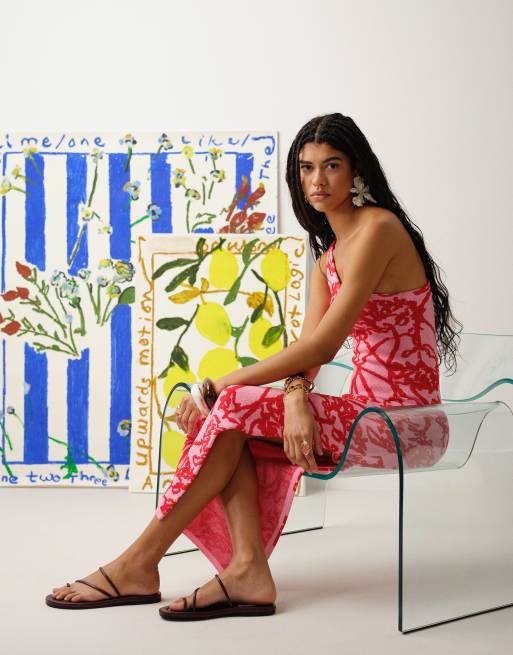 Topshop – Bradley B – Dzianinowa sukienka na jedno ramię z czerwono-różowym wzorem