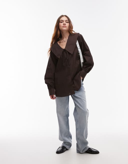Topshop – Brązowa koszula popelinowa z kobiecym kołnierzem