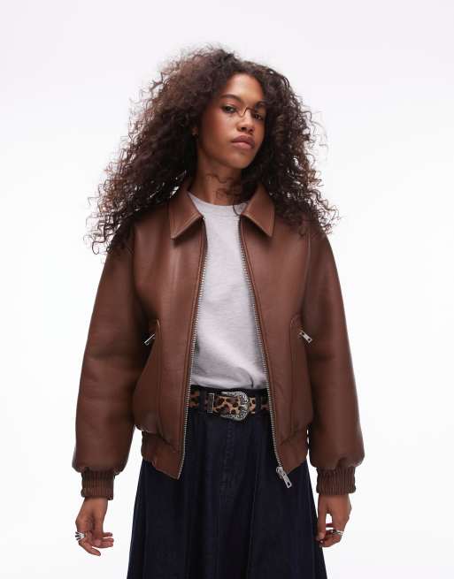 Topshop – Brązowa kurtka bomberka z imitacji skóry ze sztucznym kożuszkiem