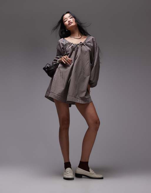 Topshop – Brązowa luźna sukienka trapezowa w kratę