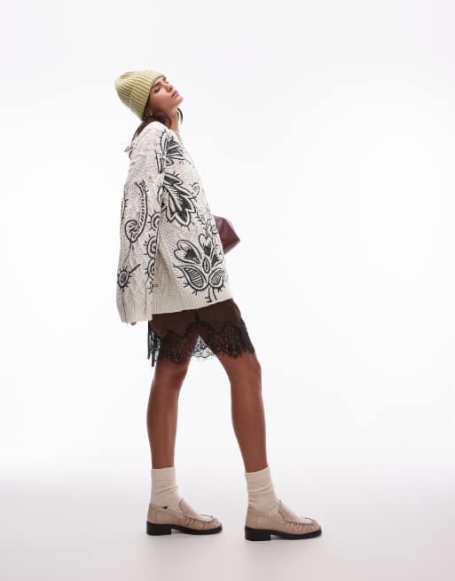 Topshop – Brązowa satynowa spódnica mini z czarną koronką