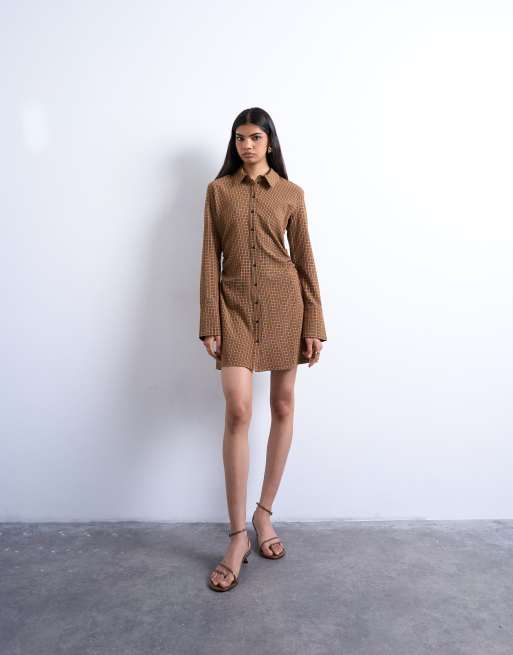 Topshop – Brązowa sukienka koszulowa mini ze zbieranymi bokami w kratę
