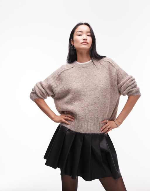 Topshop – Brązowoszary luźny sweter z okrągłym dekoltem z prążkowanej dzianiny