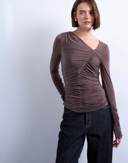 Topshop – Brązowy top z asymetrycznym marszczeniem i długimi rękawami