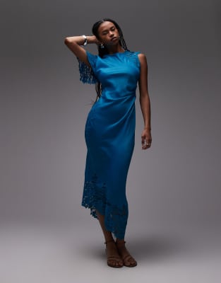 Topshop – Ciemnoniebieska sukienka midi s koronkowymi wstawkami na ramionach