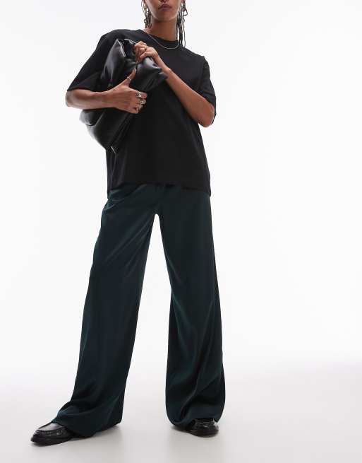 Topshop – Ciemnozielone ściągane na sznurek satynowe spodnie